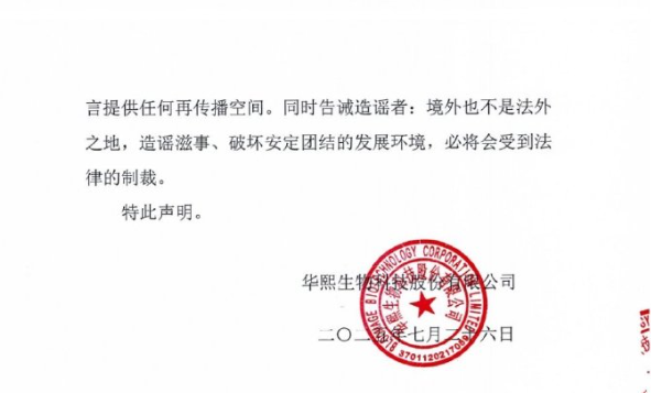 7月26日,华熙生物发布《关于网络不实信息的严正声明》。声明称,内容纯属捏造,歪曲事实,其中部分内容涉及政治谣言,性质极其恶劣。