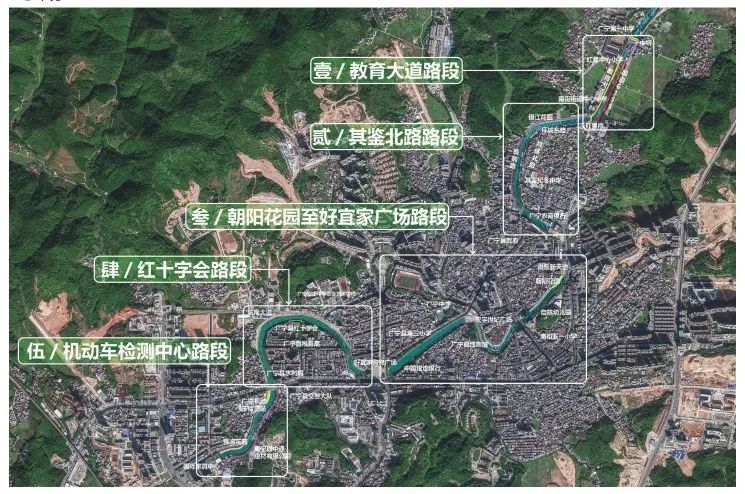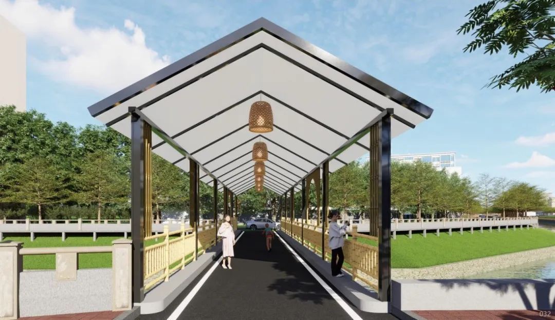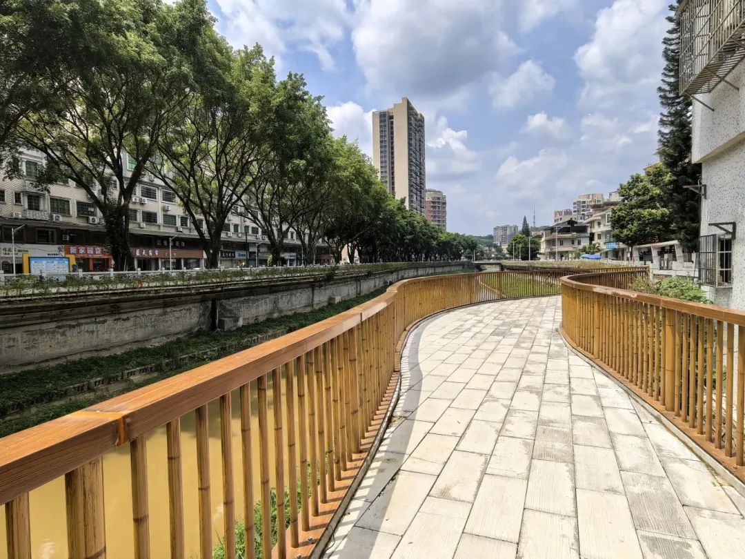 以教育大道路段为例,将重点改造广宁第一中学入口的"一中桥"和南街街道中心小学的"红星桥",在两座桥梁上加建风雨连廊。这一人性化设计不仅有效解决了师生及周边居民日晒雨淋的出行困扰,更彰显了城市建设的民生温度。同时,风雨连廊的增设将有机串联起河岸景观空间序列,与一河两岸生态碧道系统形成完整统一的滨水景观体系。