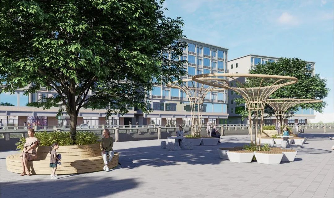 以鉴北路路段为例,将对现有功能单一的广场进行全面升级。针对场地现存的破旧树池、缺乏吸引力等问题,通过景观改造策略,一方面改造原有树池,另一方面增设特色廊架,着力打造高品质的城市社交空间。