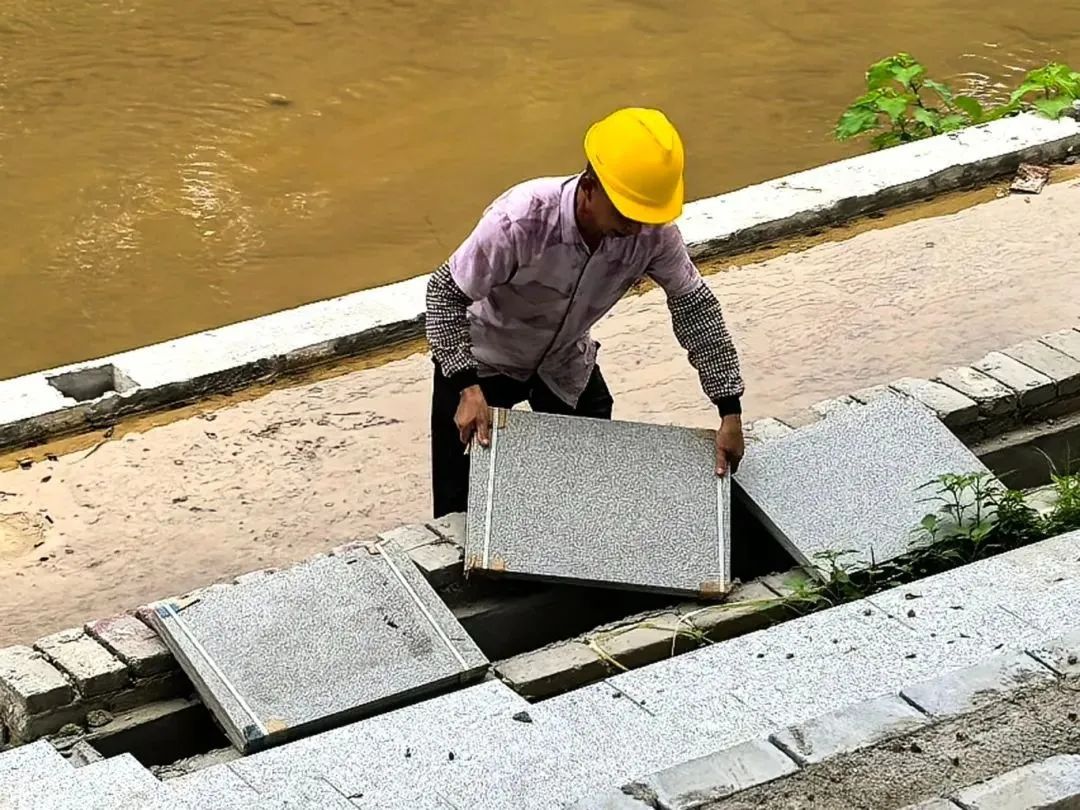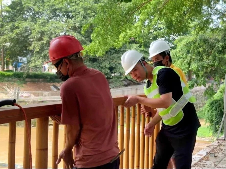 走进热火朝天的施工现场,工人们正全神贯注地安装极具地方特色的竹纹不锈钢护栏。电焊火花飞溅间,一条蜿蜒的生态步道轮廓正逐渐显现。不远处,另一组施工人员正手持水平仪仔细校准台阶高度,伴随着"叮叮当当"的敲击声,一块块青砖被精准铺设到位。机械的轰鸣声与工人的吆喝声此起彼伏,5.7公里的滨水步道长廊正在加速成型!