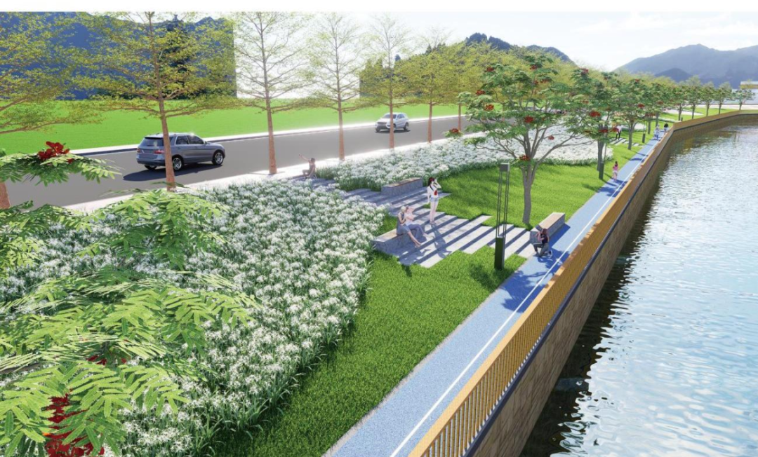 在国道355沿线区域,设计方案将巧妙引导人流从国道向河岸过渡。具体实施上,将在现有河岸实体墙基础上打造彩色混凝土亲水步道,通过斜坡绿化带植入特色景观植物,并结合休闲阶梯空间设计,最终形成一系列舒适宜人的滨水休憩节点。